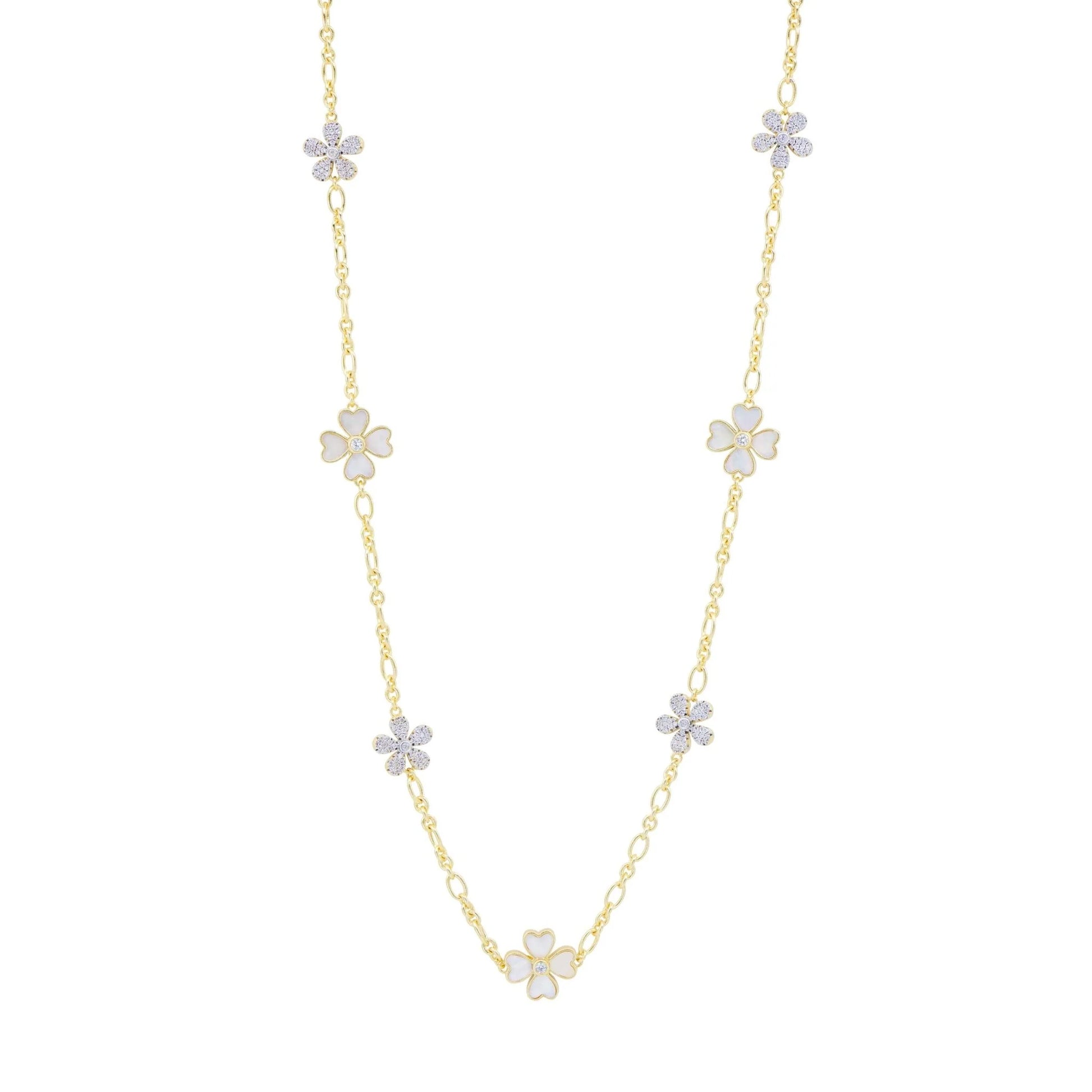 - Hand-set clear cubic zirconia stones and flat cut mother of pearl