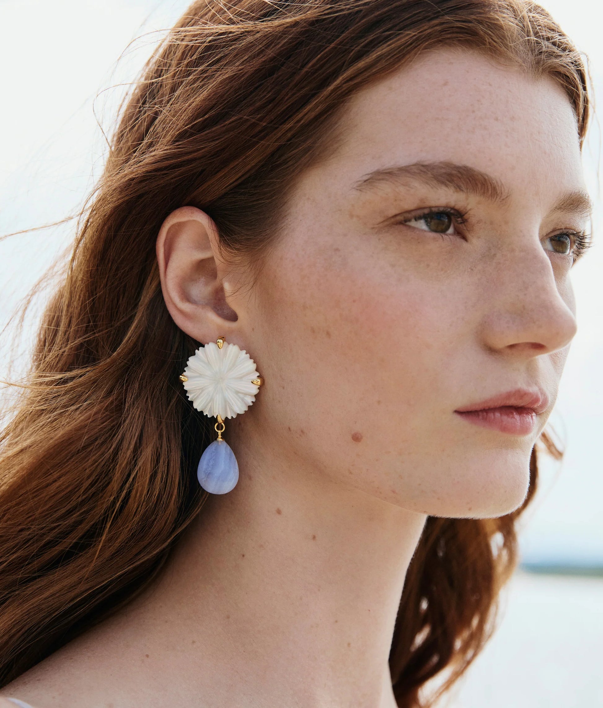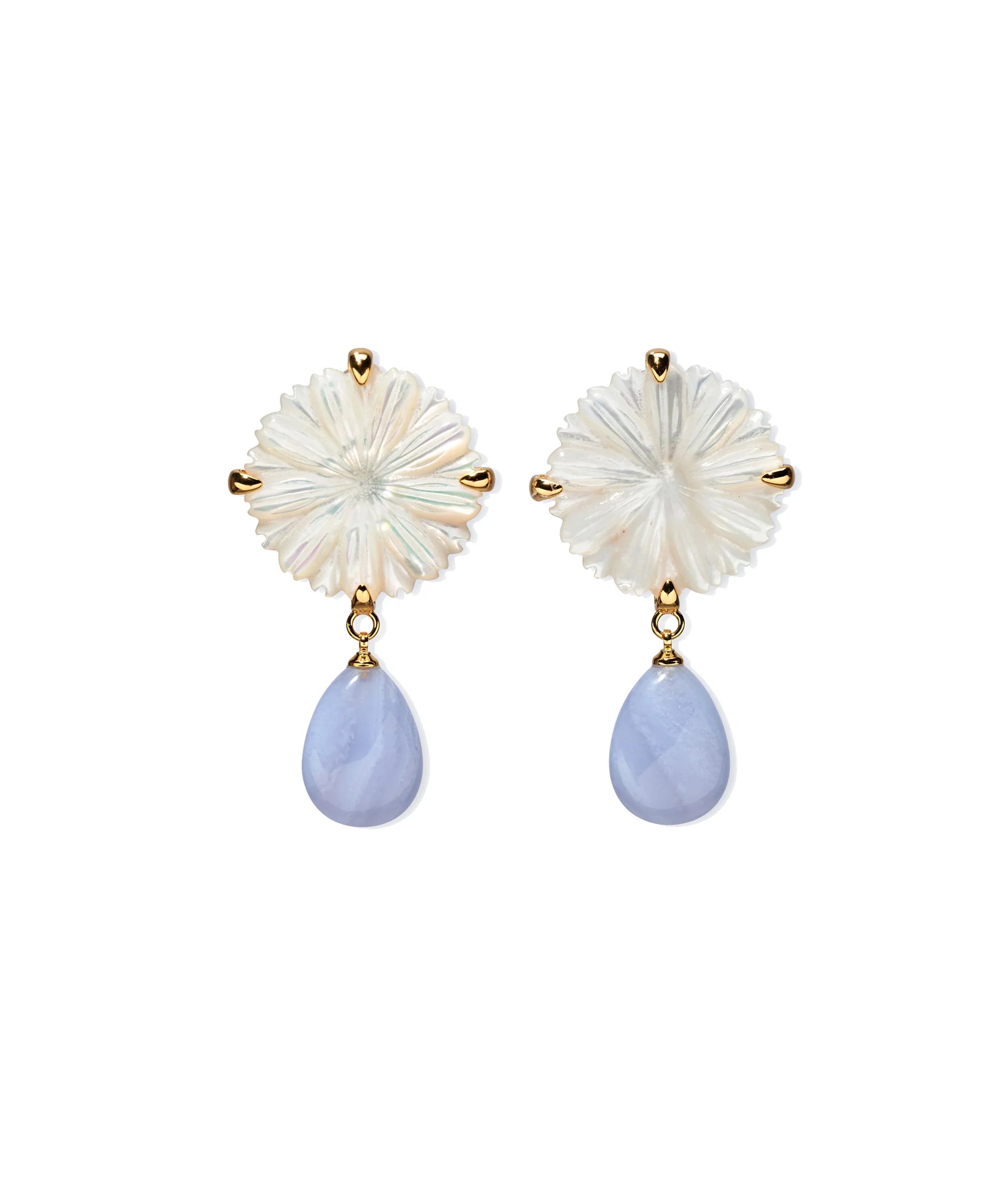 - Mother-of-pearl carved flower earrings with hanging blue lace agate drops